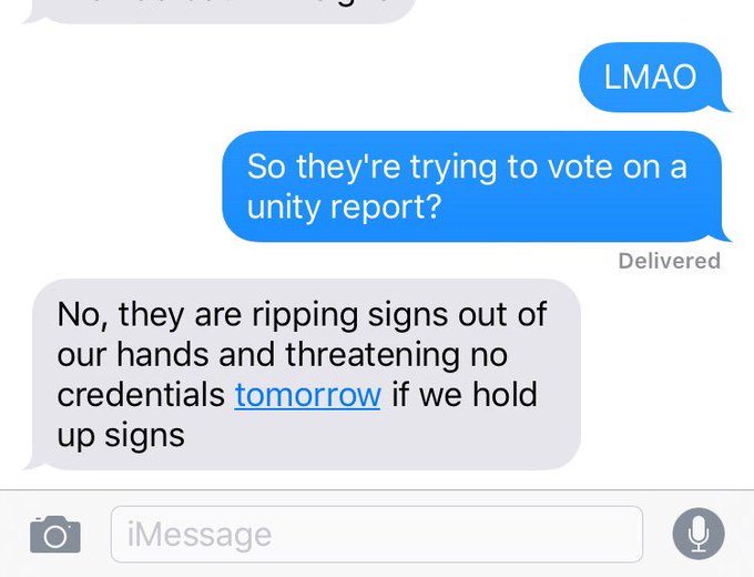 “They are ripping signs out of people’s hands and threatening no credentials tomorrow if we hold up signs,” one Sanders delegate allegedly said in a text message exchange posted online by a friend.