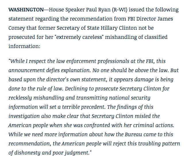 "While I respect the law enforcement professionals at the FBI, this announcement defies explanation. No one should be above the law. But based upon the director's own statement, it appears damage is being done to the rule of law," Ryan said in a statement, adding that declining to prosecute Clinton for her handling of classified information "will set a terrible precedent."