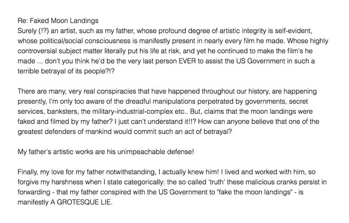 It has now emerged that Kubrick’s daughter Vivian is not a fan of this theory, going so far as to write an open letter vehemently chiding those who believe it to be true.